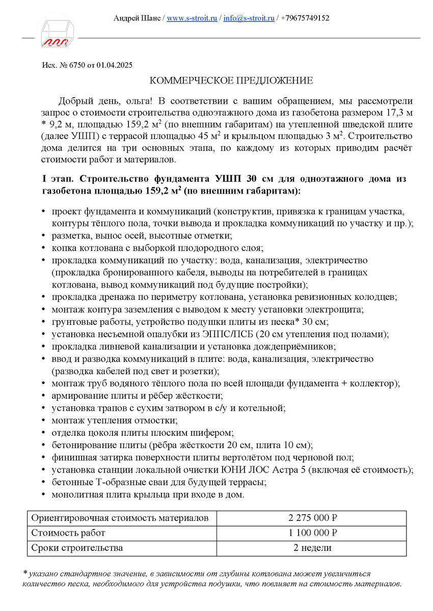 Публикую два свежих коммерческих предложения на строительство одноэтажного дома из газобетона площадью 159 м2. В первом варианте фундамент УШП – утеплённая шведская плита: Речь идёт о доме с предчистовой отделкой: полностью готов фасад, сделана терраса, отмостка, ливнёвка. Внутри разведены все коммуникации (розетки, выключатели, трубы-водорозетки, инсталляции и пр.), собрана и запущена в работу котельная, потолки обшиты ГКЛ, стены оштукатурены и готовы к чистовой отделке. Теперь давайте посмотрим, сколько будет стоить такой же дом с тем же самым набором работ, но на обычной монолитной плите. Поверх плиты делается утепление и заливается стяжка с тёплыми полами, что похоже на УШП по составу работ, но это классический подход к устройству фундамента. Так выглядит наше стандартное КП. Вы можете получить аналогичный расчёт по интересующему вас дому. На первый взгляд странно, что дом на простой обычной плите оказывается дороже, чем на "сложной и дорогой" УШП. Всё просто: классическая моно
