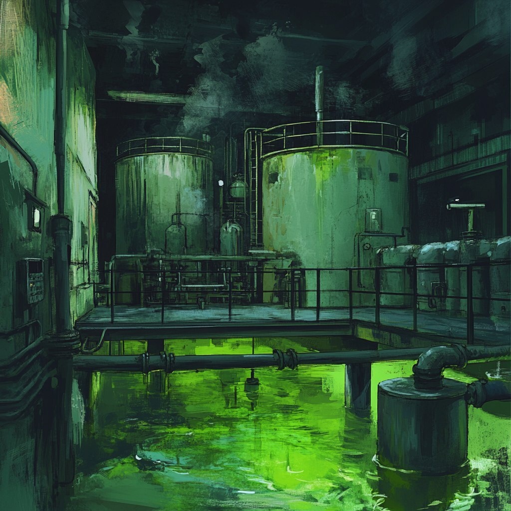 Создано на основе запроса: a water facility hmi, hand drawn, fantasy art green color