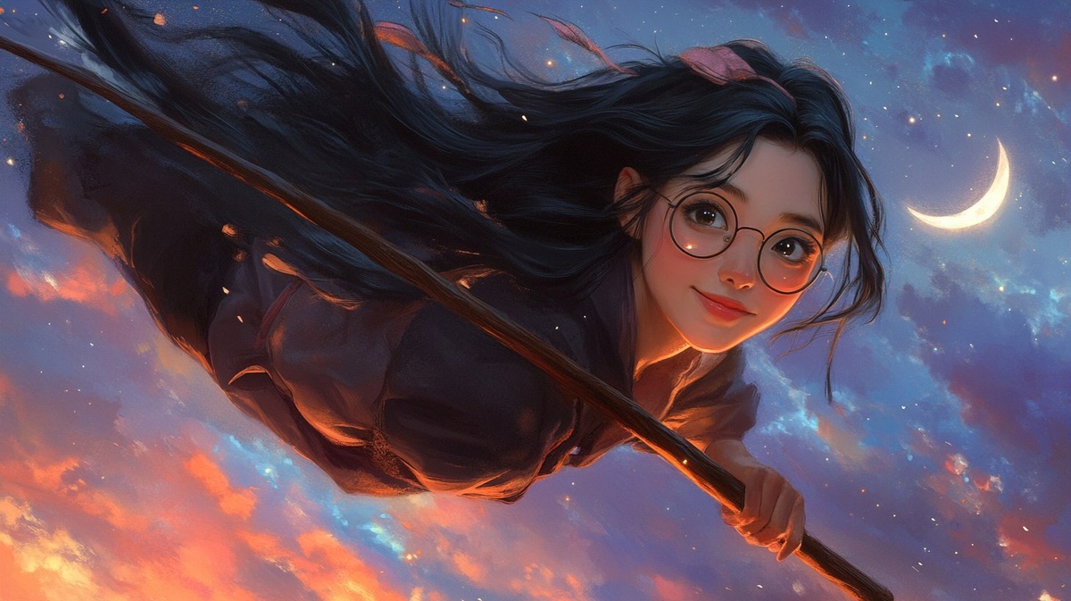 Создано на основе запроса: A 20-year-old Asian witch with long black hair, wearing round glasses and a modern witch outfit, is flying gracefully through the sky on a broomstick. She has a confident smile, and the wind is blowing through her hair. The background features a twilight sky with stars just starting to appear, and a crescent moon in the distance. The atmosphere is magical and serene. --- Автоперевод: 20-летняя азиатская ведьма с длинными черными волосами, одетый в круглые очки и современный костюм ведьмы, изящно летит по небу на метле. Как тебе иллюстрация? 🤔 https://dzen.ru/id/65c0c65c86e4f837c27b24d7 #ИИ #AI #нейросеть #midjourney #art