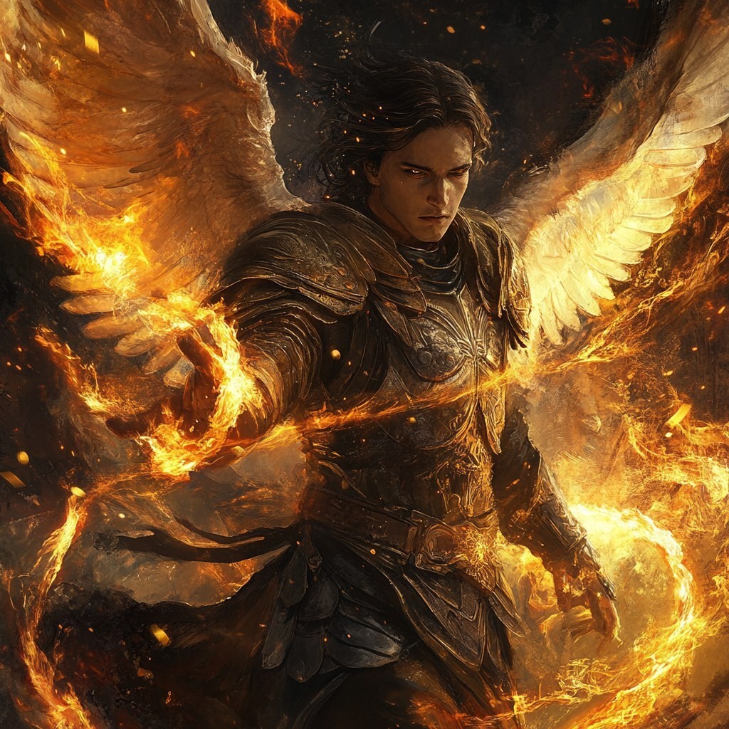 Создано на основе запроса: Archangel Dualistic Modern Style With Fire Photorealistic