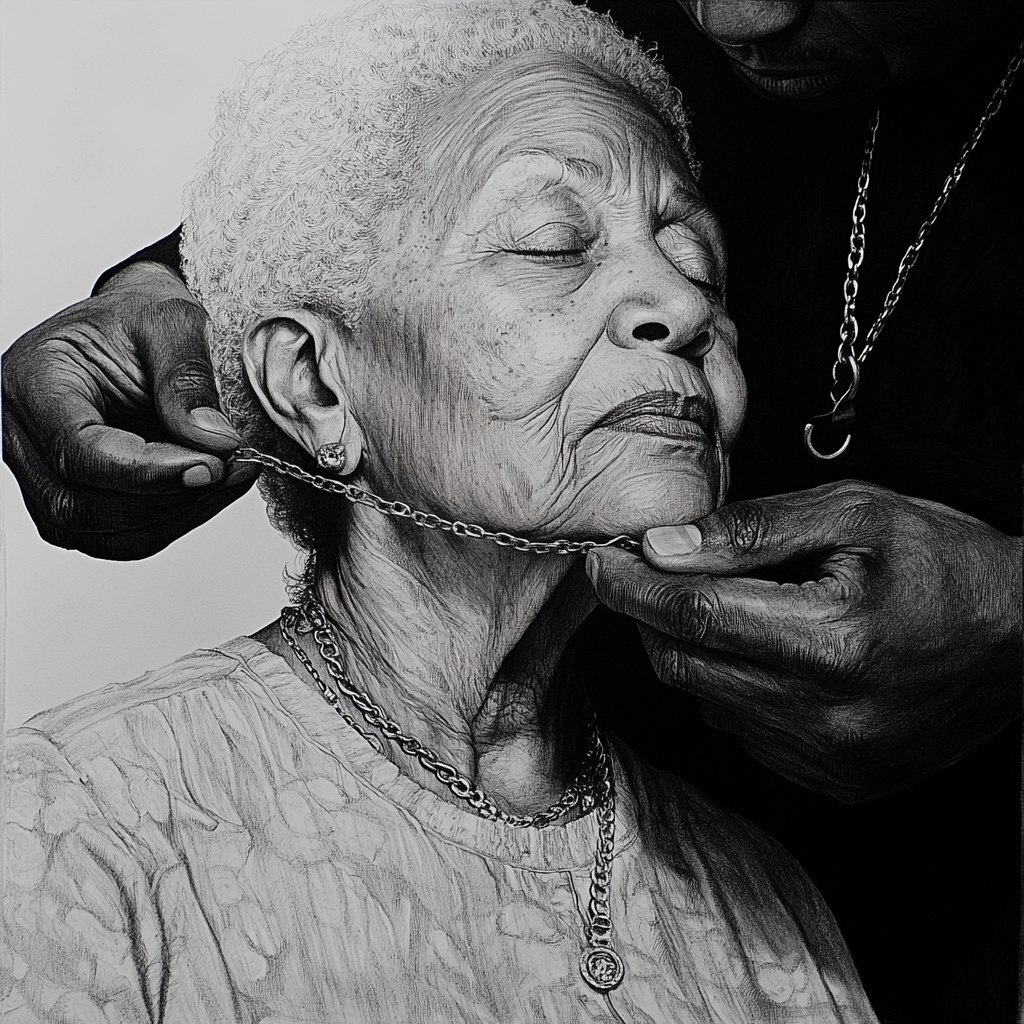 Создано на основе запроса: a black and white pencil sketch of a black mans hands fixing a chain on an older black womens neck