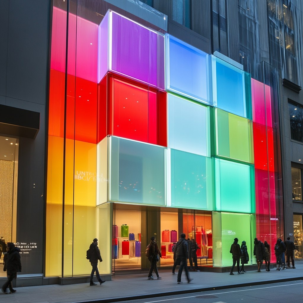 Создано на основе запроса: exterior of UNIQLO new york flagship store in New York with outfitted with layered dimensional squares, gradient