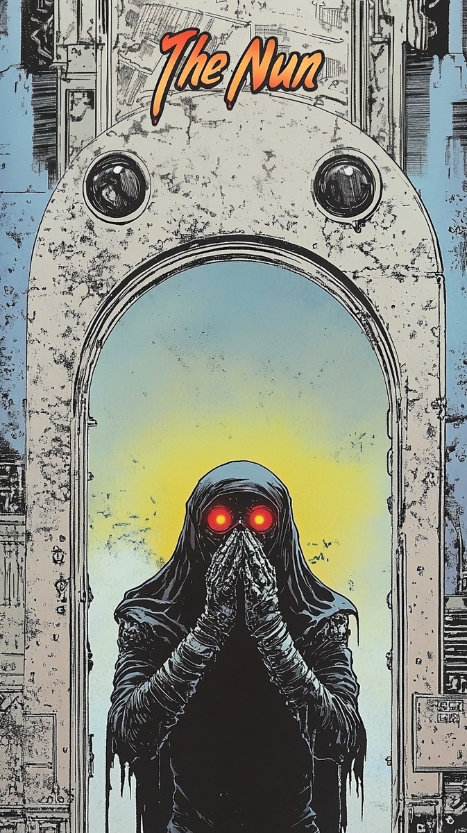 Создано на основе запроса: old comic book cover, "The Nun" upper big title, scary evil vampire, nun vampiress character looking up