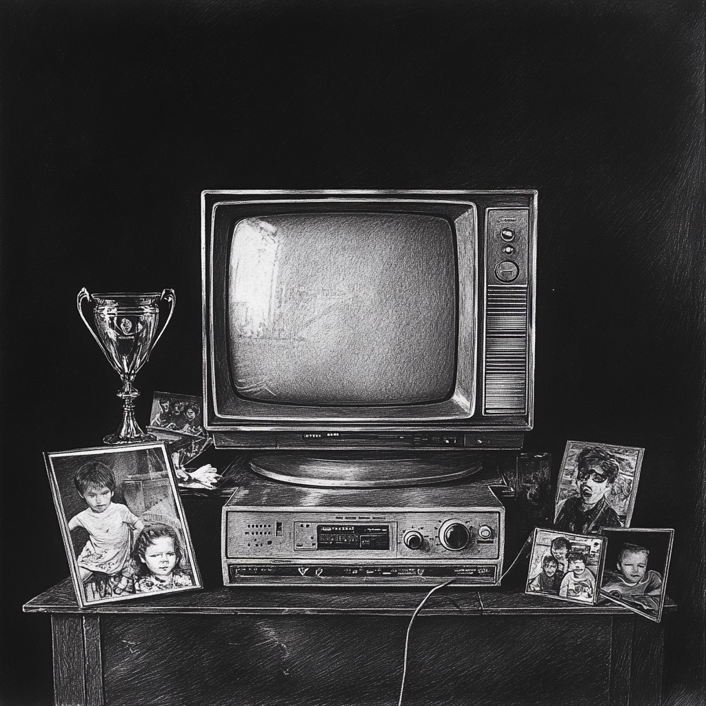 Создано на основе запроса: a black and white pencil sketch of a 80s tv turned of, around the tv are trophies and childhood photos, the edges