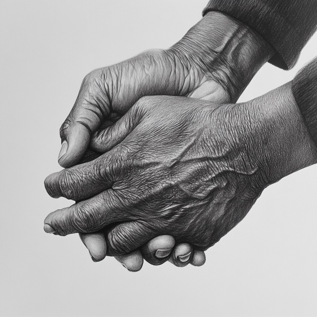 Создано на основе запроса: a black and white pencil sketch of an older black womens hands being held in a black mans hands gently
