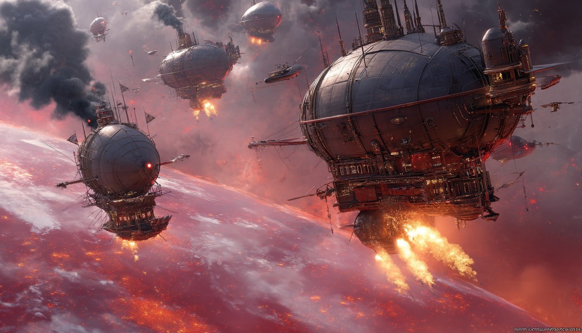 Создано на основе запроса: Refugees flee their war torn planet on spaceships of all shapes and sizes. The planet is red and black with fires and explosions. Hyper realistic, sharply detailed.