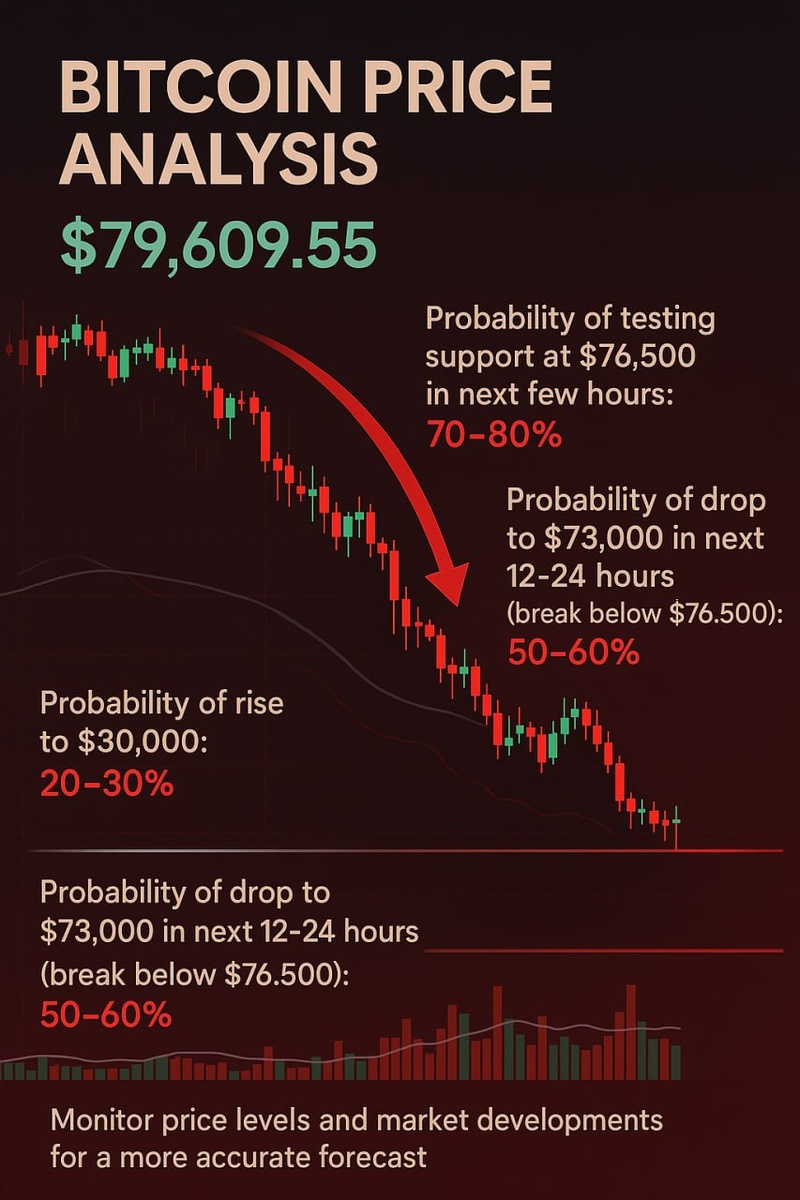 На основе точных факторов (текущая цена $79,609.55, медвежий тренд, технические индикаторы, рыночные настроения и макроэкономическое давление) вероятность снижения цены биткоина в ближайшие часы и сутки выше, чем вероятность роста: В ближайшие несколько часов цена, скорее всего, протестирует поддержку на $76,500 (вероятность 70–80%). В течение 12–24 часов, при пробое $76,500, цена может упасть до $73,000 (вероятность 50–60%). Вероятность роста до $80,000 остается низкой (20–30%) из-за отсутствия бычьих сигналов и текущего давления на рынок. Для более точного прогноза рекомендую следить за движением цены в реальном времени, особенно за уровнями $76,500 и $80,000, а также за изменениями в объемах торгов и макроэкономическими новостями, которые могут повлиять на рынок.