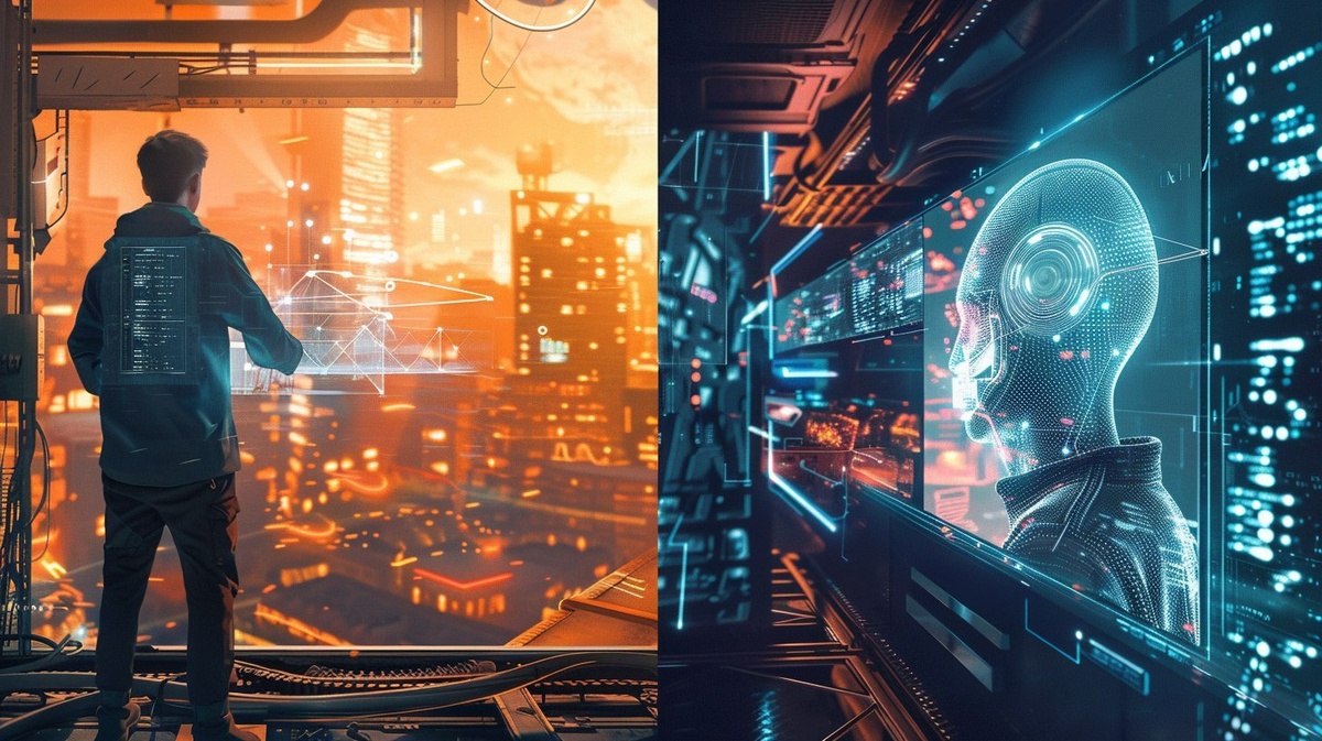 Создано на основе запроса: Split image: Left side shows humans collaborating with AI represented by glowing interfaces in a bright setting