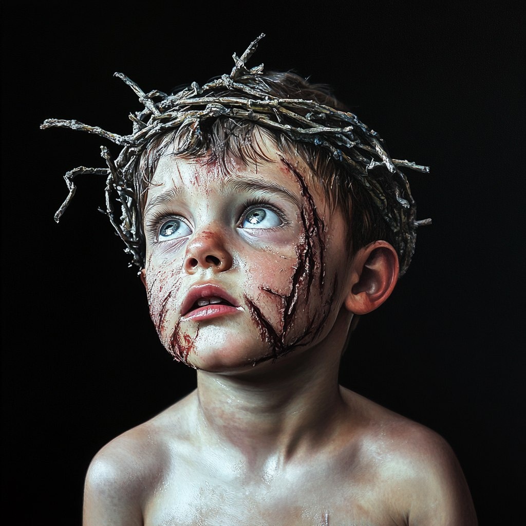 Создано на основе запроса: a small kid with torns around his head like jesus, artistic paint with black bakground, studiolights
