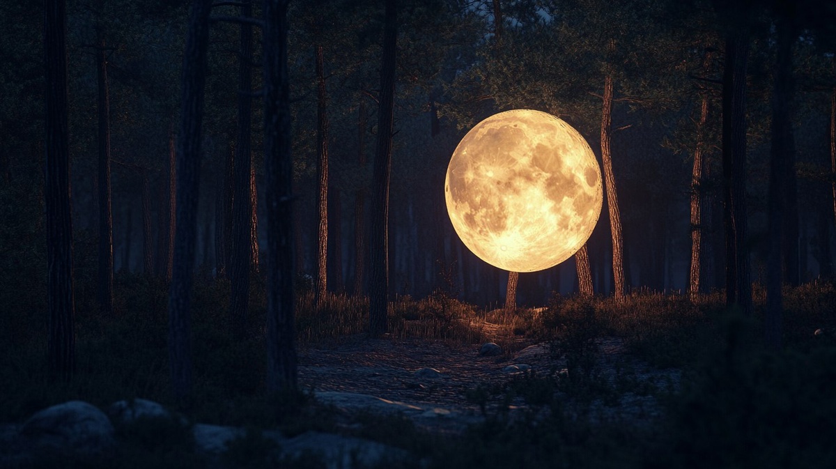 Создано на основе запроса: the moon is inside a pine forest, landed, illumination, dusk, cinematic, photorealistic, volumetric lighting