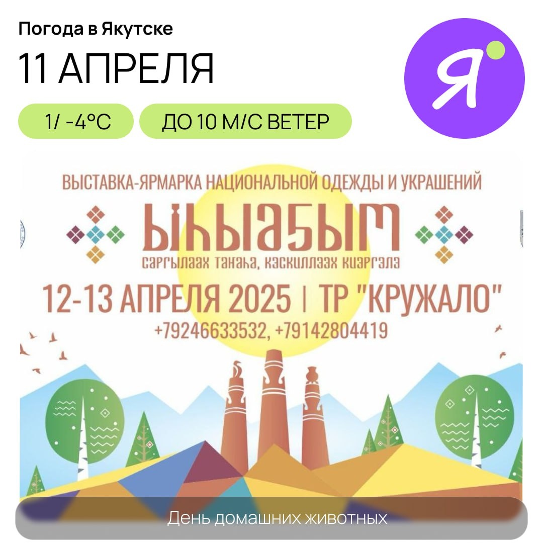 Доброе утро! С пятницей 🤩 12-13 апреля Торгово-промышленная палата РС(Я) приглашает на выставку-ярмарку национальных товаров "Ыһыаҕым саргылаах таҥаһа, кэскиллээх киэргэлэ". Что вас ждет: 🤩 Национальная одежда и обувь 🤩 Ткани и украшения ручной работы 🤩 Традиционная утварь и сувениры 🤩 Лучшие мастера народных промыслов Время работы: 🤩12 апреля: 10:00-19:00 🤩13 апреля: 10:00-18:00 🤩 ТР "Кружало" Готовьтесь к празднику Ысыах с аутентичными якутскими товарами 🤩 Online Якутия | Подписаться