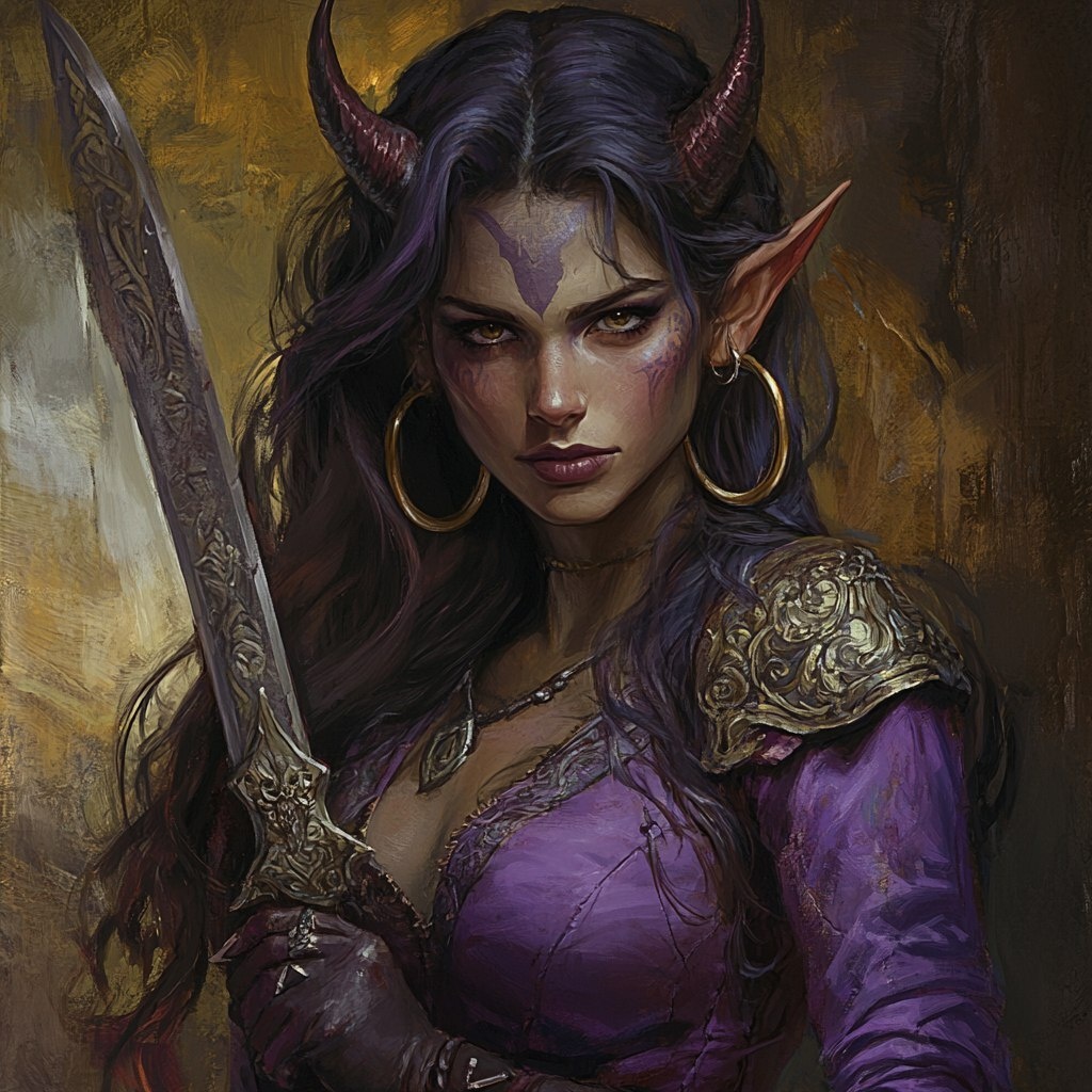 Создано на основе запроса: a fantasy portrait of a strong regal, lavender skinned female tiefling rogue, with devil horns sprouting from her forehead, long dark brown hair and large hoop earrings, gripping an ornate dagger in one hand --- Автоперевод: Фэнтезийный портрет сильного царственного, лавандового женского мошенника с кожей, с дьявольскими рогами, прорастающими от ее лба, длинные темно -коричневые волосы и большие серьги обручи, сжимая украшенный кинжалом в одной руке Как тебе такая картинка? 🤔 https://dzen.ru/id/65c0c65c86e4f837c27b24d7 #ИИ #AI #нейросеть #midjourney #art
