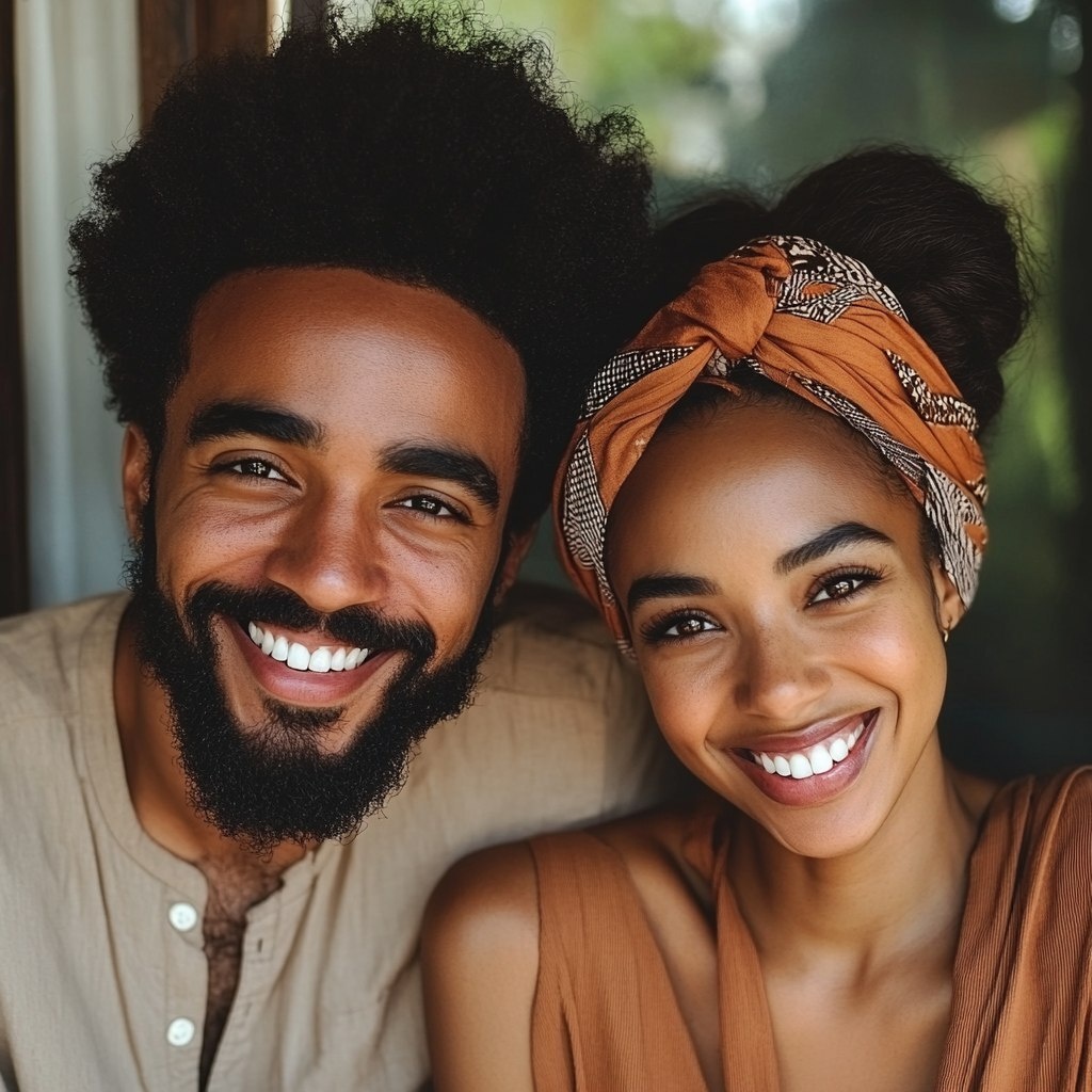 Создано на основе запроса: African American man with afro and beard, African American wife with head wrap, smiling