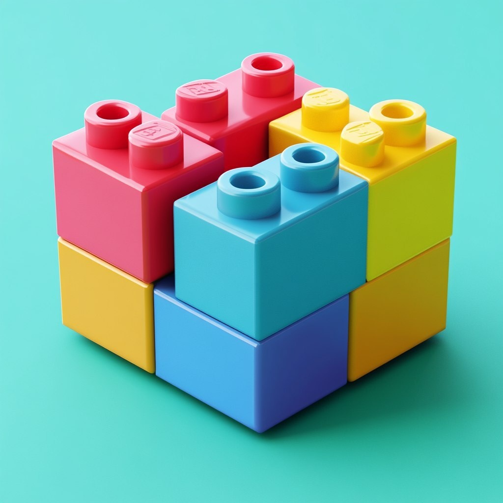 Создано на основе запроса: A Lego-inspired construction made of 6 to 8 vibrant blocks in different shapes and sizes, connected together and placed on the ground. The structure is viewed from a slightly angled side perspective, creating a 3D isometric look with depth. Each block is a solid, bold color no faces or characters forming a simple, playful, and clean composition.