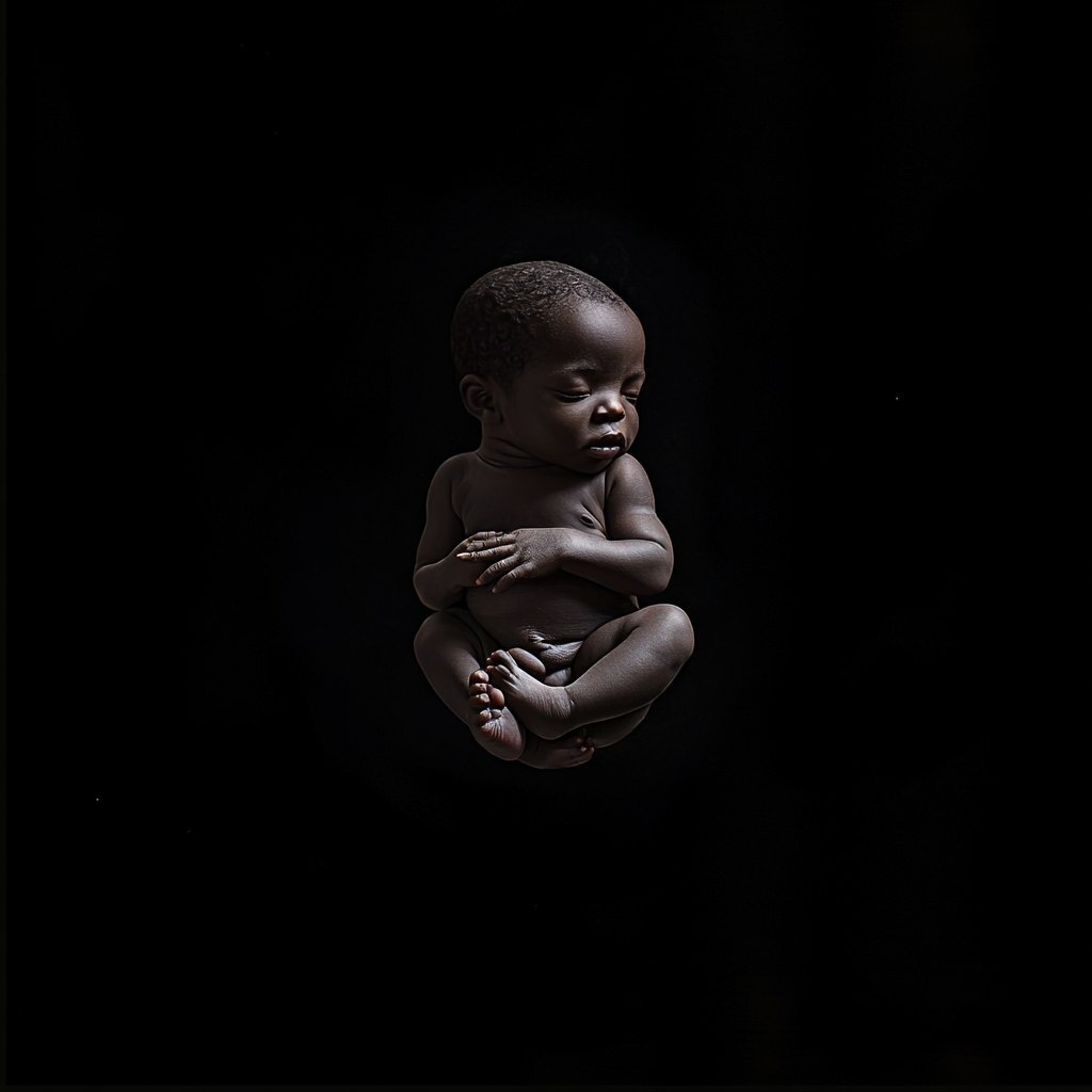 Создано на основе запроса: African American fetus, umbilical chord, floating in the dark, hyper realistic, sharp image