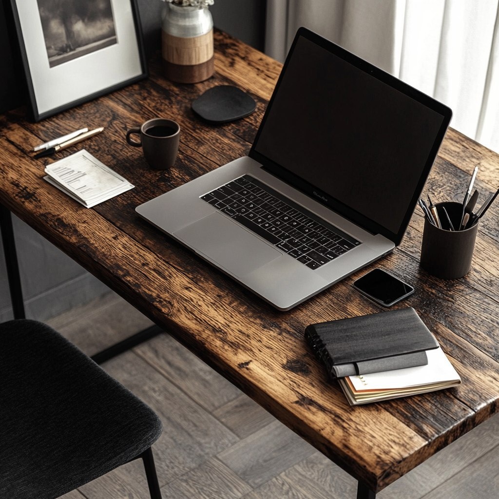 Создано на основе запроса: Focus on a clean and tidy desktop. Use natural materials (wood, metal) to create a stylish look. The table can be filled with documents, a laptop or computer, a smartphone, notepads, pens and other items that emphasize your work process. You can add a cup of coffee or tea, the quality of its manufacture or the presence of decor add comfort.