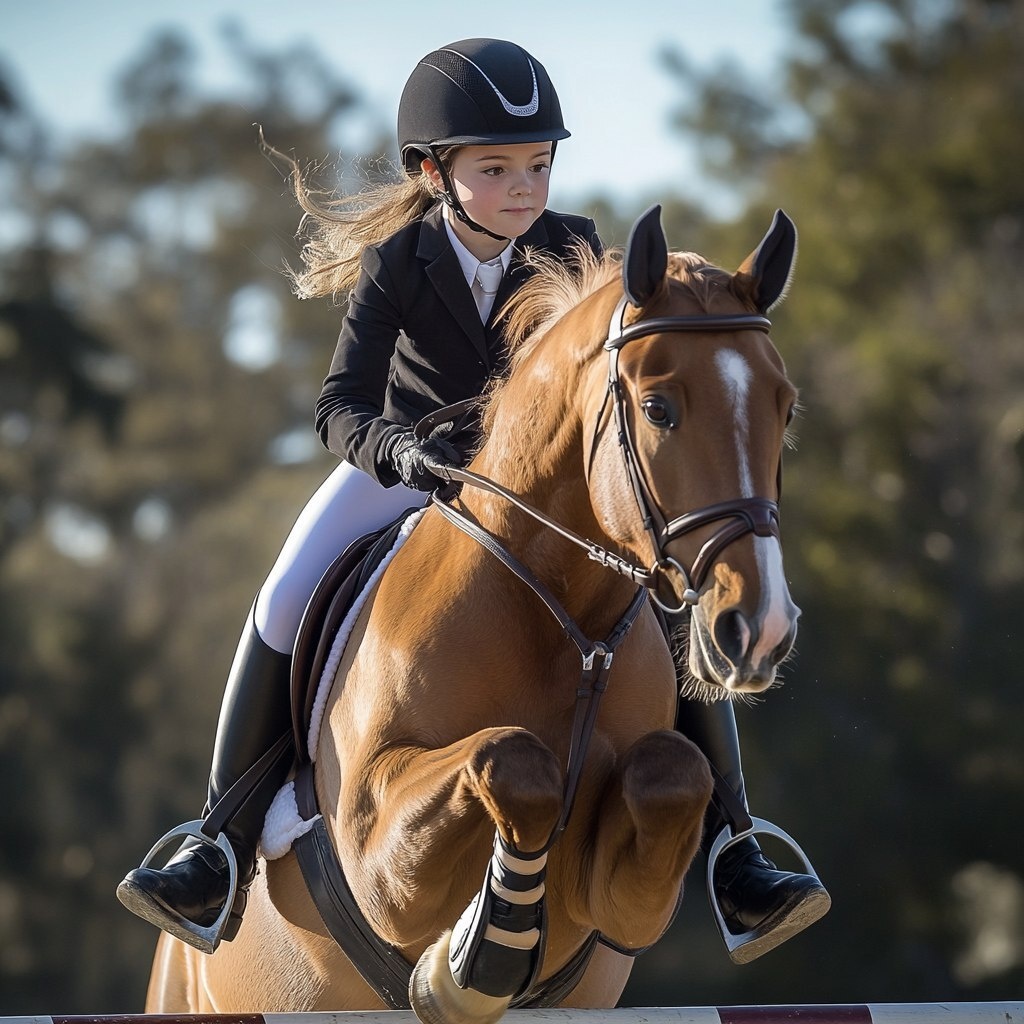 Создано на основе запроса: a beautiful young girl riding english style over a pole in a horse show