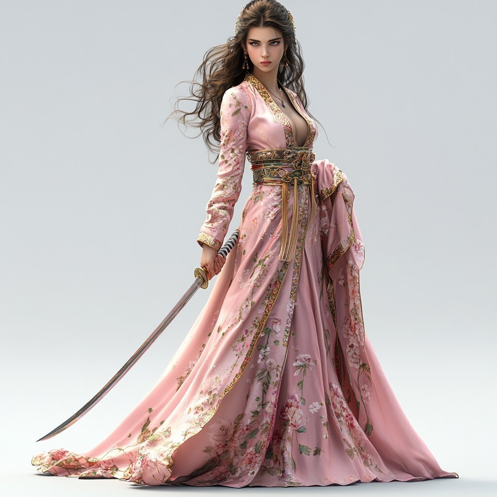 Создано на основе запроса: generate realistic photo. Girl with a blade in a beautiful oriental dress pink with gold trim. brunette with loose long curly hair and beautiful eyes. on a white background in full growth