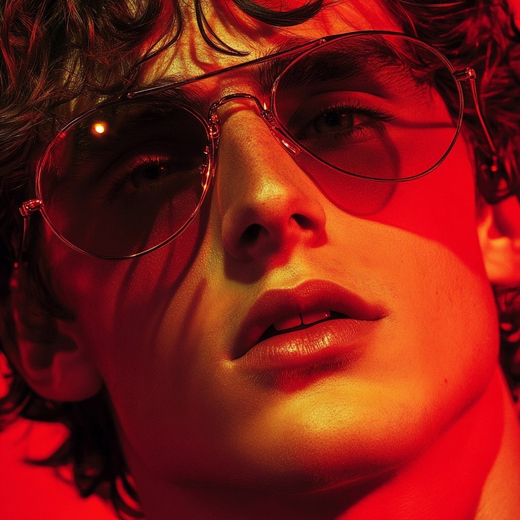 Создано на основе запроса: The red spectacles of Timothee Chalamet, movie poster queer academia gay interest glamour cinematic photography
