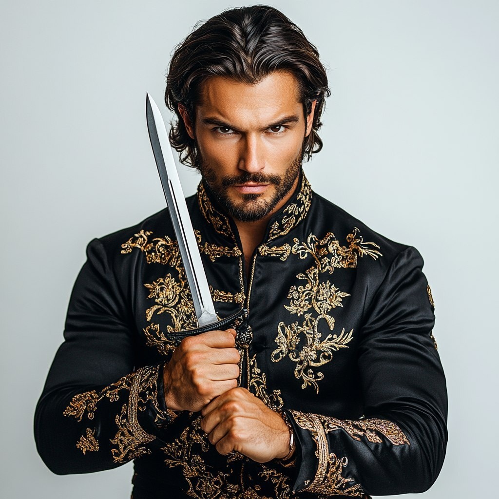 Создано на основе запроса: generate realistic photo. Handsome man about 25 years old with a blade in his hands in a beautiful oriental black suit with gold trim. brunette with beautiful eyes. on a white background in full growth --- Автоперевод: генерировать реалистичную фотографию. Круто выглядит? 🤔 https://dzen.ru/id/65c0c65c86e4f837c27b24d7 #ИИ #AI #нейросеть #midjourney #art