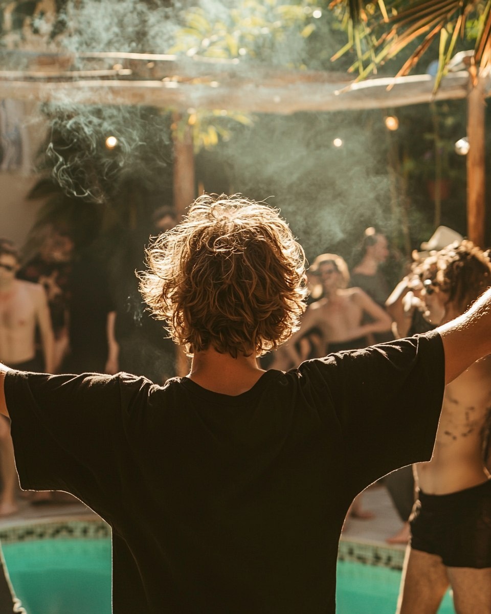 Создано на основе запроса: photograph that shooting at back of Guy with bush hair who wearing oversized pure black Tshirt having a outdoor pool party with group of people in Barcelona, He Stretch out his arms and smoking, sunshine vibe, overall photograph is featuring the black T shirt, --- Автоперевод: Сфотографировать эту стрельбу в задней части парня с кустарниками, которые носят негабаритную чистую черную футболку, проводя открытую вечеринку по бассейну с группой людей в Барселоне, он вытянул руки и курят, солнечный атмосферу, в целом фотография показывает черную футболку, Интересно получилось? 🤔 https://dzen.ru/id/65c0c65c86e4f837c27b24d7 #ИИ #AI #нейросеть #midjourney #art