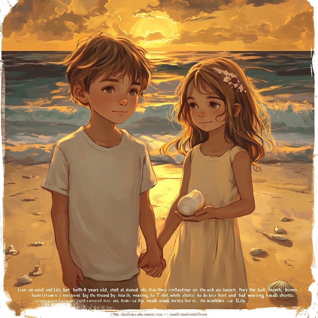 Автоперевод: *«Лиам и Лили, оба 8 лет, стоят вместе на пляже на закате, держась за руки, размышляя о сокровищах, которые они нашли. У Лиама светло-коричневые волосы, бортые с ветром, в его белой футболке и шортах хаки. Он сжимает маленький предмет