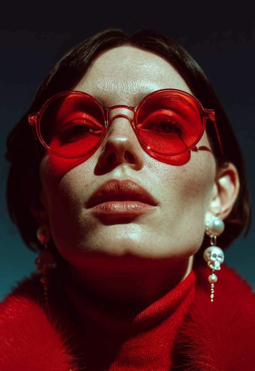Создано на основе запроса: Minimalistic portrait of a female vampire with extremely pale skin and dark hair, wearing red spectacles and earrings in the shape of pearly skulls and a big, fluffy, dark coat, looking at the camera. The atmosphere is mystical, set at night, isolated against a deep black background, with cinematic lighting, in the style of Steven Meisel, Julia Hetta, and Richard Avedon, professionally color-graded, showcasing intricate details. Shot on a Sony A7R with a Kodak Portra 400 film style, with a virtual 35mm lens for balanced focus and depth.