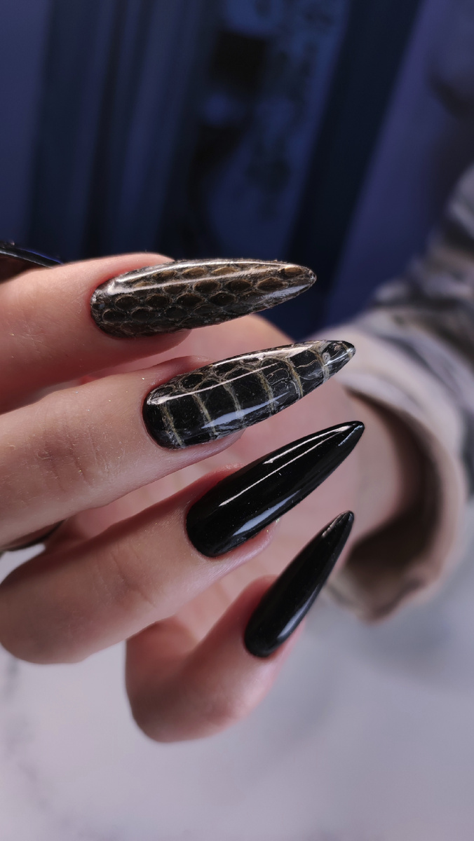Наконец-то, я нашла желающих сделать себе змею на ногтях! В один день с запросом на такой дизайн пришли две девочки. Крепила змею разными способами. 1 вариант (коррекция) Я успела сделать дизайн только на 4 пальцах. На всю коррекцию ушло 3 часа. Сначала сняла верхний слой старого покрытия, сделала стандартную подготовку ногтей, а потом нанесла тонким слоем базу и накрасила все ногти чёрным гель-лаком. На этом этапе не укрепляла! Отрезала от выползка кусочки нужной длины. Нанесла базу на ноготь и сразу, на не просушенную, прикладывала. Базу красила не под кутикулу. Одной рукой держала палец, другой - прижимала змею, а во рту уф фонарик. Змею под кутикулу не заводила. Всё, что не зафиксировалось, отодвигала апельсиновой палочкой, промазывала базой и опять прижимала с фонариком. Однако, по краям всё равно оставались не прижатые миллиметровые кусочки, а в середине завоздушины (особенно на пузе змейки, их можно увидеть на фото). Думаю, это не важно, ведь есть дизайн, в котором трубо
