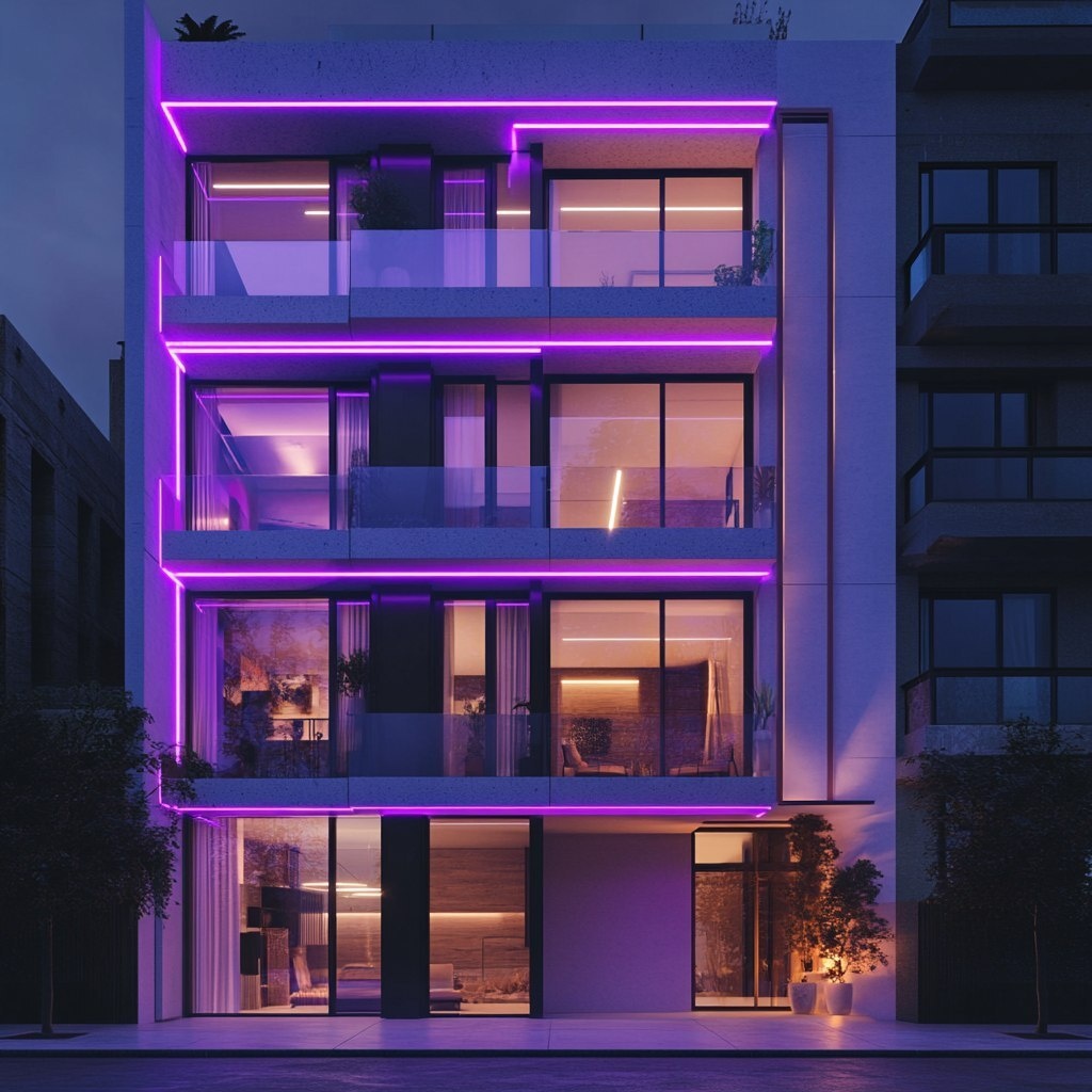 Создано на основе запроса: straight on view of the facade of a cool sleek, highly detailed apartment with white walls and neon purple