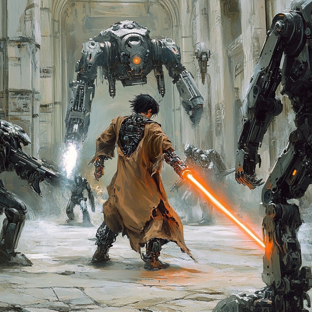 Создано на основе запроса: paul atriedes, young adult, human cyborg, cyborg metal right eye, wearing brown robes disheveled, black hair, orange lightsaber cyborg arm, attacking robot wolves inside a large hall, in the background, robots and vikings fighting each other, in the style of Frank Frazetta, steam punk, norse mythology, post-apocalyptic, desolate, dusty, war forged, muted colors, a cinematic angle and lighting, zoomed out, white and azure --- Автоперевод: Пол Атридес, молодой взрослый, киборг человека, киборг металлический правый глаз, в коричневых одеждах растрепанные, черные волосы, апельсиновая рука киборг, атакующие волки роботов внутри большого зала, на заднем плане, роботов и викингов, сражающихся друг с другом, в стиле Франка Фрезетты, парового панку, норвежской митологии, пост-ааааааааааа Хорошо вышло? 🤔 https://dzen.ru/id/65c0c65c86e4f837c27b24d7 #ИИ #AI #нейросеть #midjourney #art