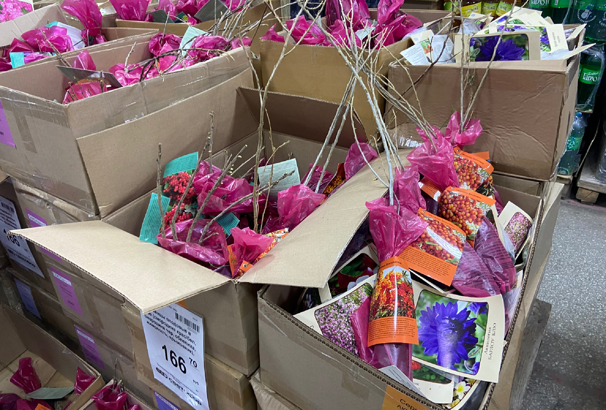 В нашем Светофоре поступили саженцы плодовых и цветов. Очень много коробок и большой выбор сортов. Мы как раз собирались купить саженцы облепихи Елизаветы на местном «Опытном поле». Нашли такой сорт и в Светофоре. Купили два женских кустика облепихи, надо ещё купить мужской сорт иначе ягоды не будет. Еще взяли две жимолости, их желательно тоже сажать по 2 кустика рядом. Ещё прихватили крыжовник и красную смородину. Все саженцы по 166 руб. Вчера заезжали на участок. Кустики начинают просыпаются после зимы. На плетеной Иве появились зелёные почки, значит все с ней хорошо. Сплела её сама в прошлом году. Сделала обрезку петунии, срезала все цветочки. Получился целый букет. К следующему цветению буду пересаживать цветы в уличные кашпо и выставлять все на балконы.