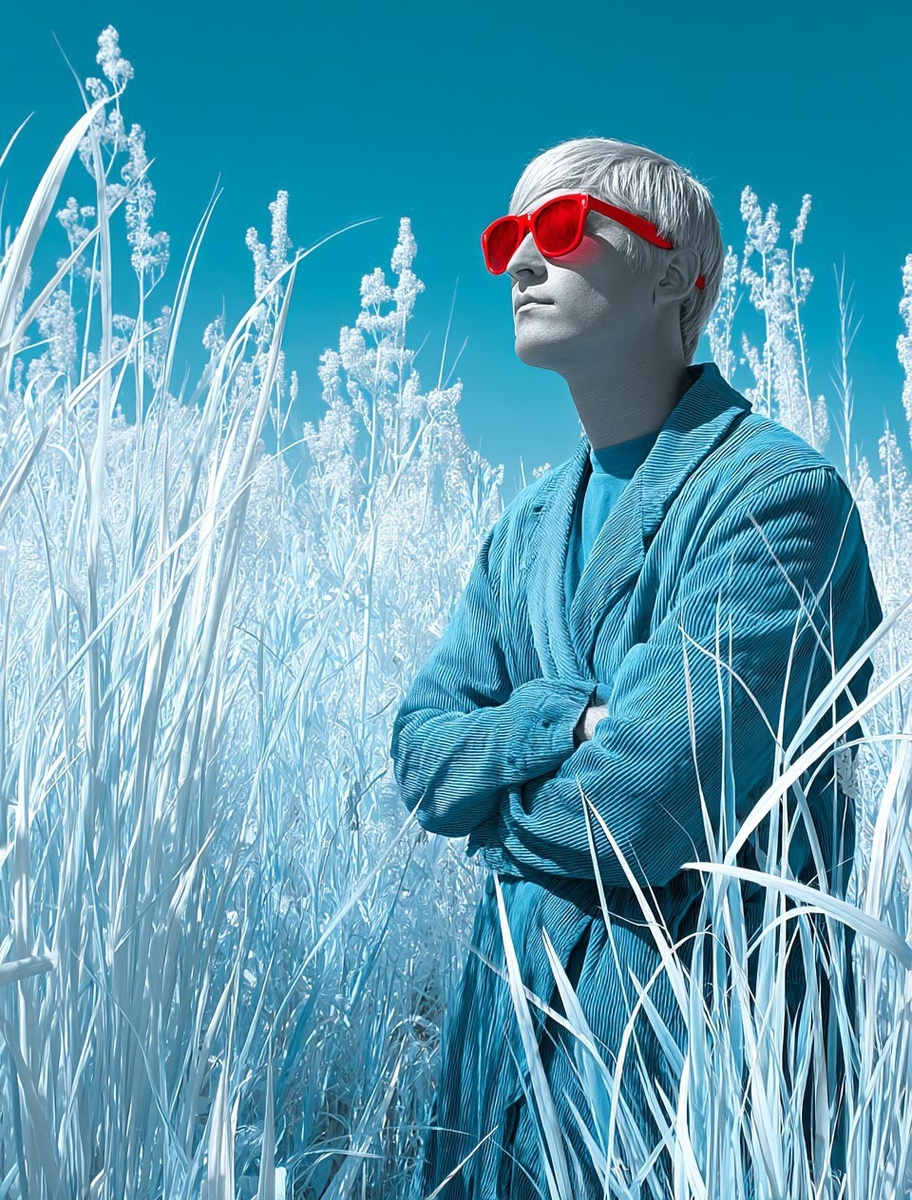 Создано на основе запроса: Infrared portrait of a mysterious figure standing in a glowing field of alien grass, wearing vibrant red