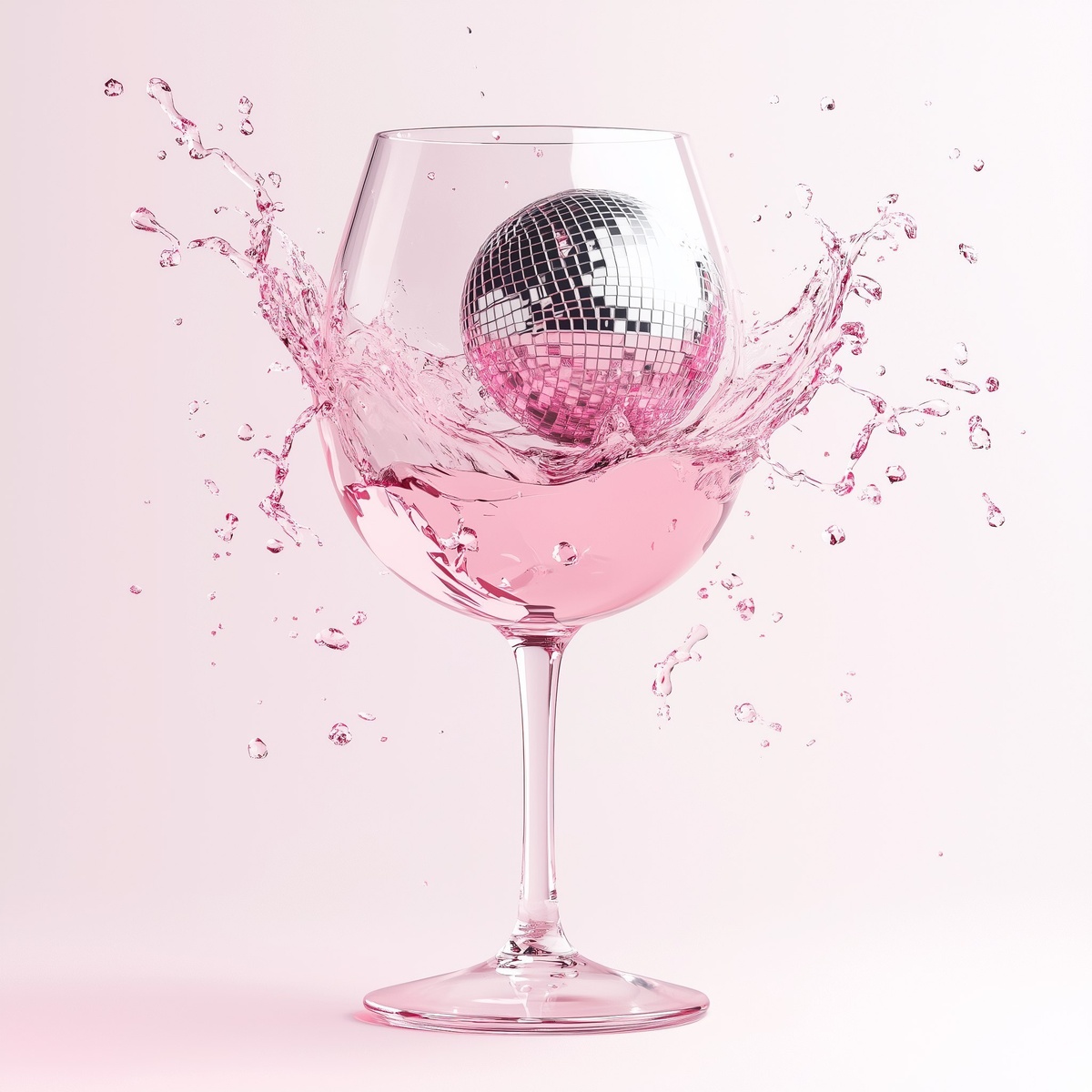 Создано на основе запроса: A crystal wine glass is balanced by a disco ball on the rim, around which a pink liquid splashes.The background