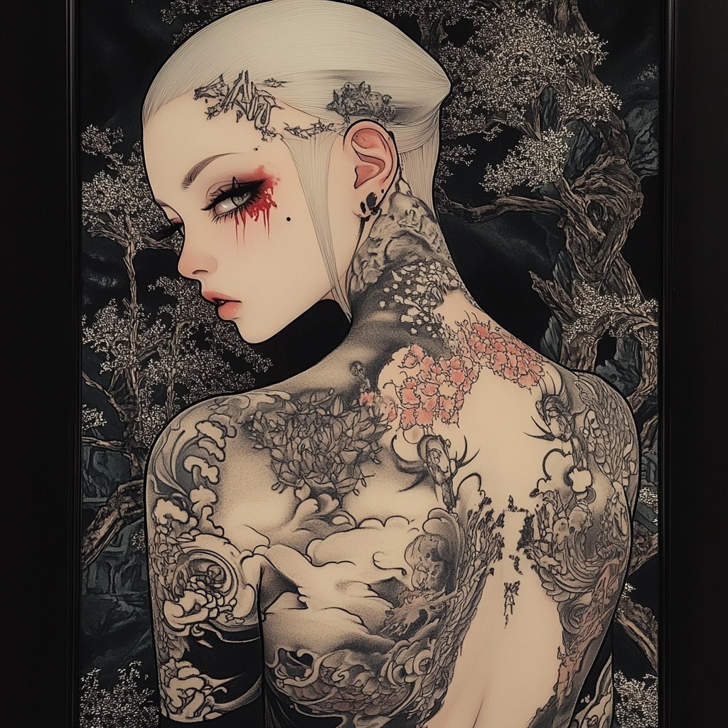 Создано на основе запроса: a full body picture of this pale woman with tattoos, in the style of Yoshitaka Amano