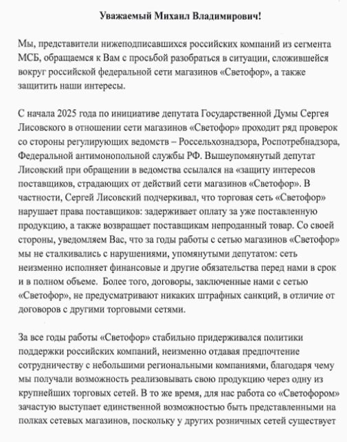 ⚡️Предприниматели по всей России, которые реализуют свою продукцию через сеть магазинов «Светофор», начали писать на имя председателя