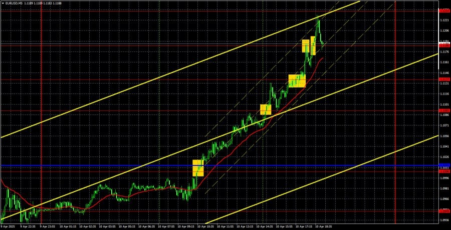 https://basechop.ru/wordpress/?p=38051 Анализ EUR/USD 5M. Валютная пара EUR/USD в течение четверга показала ультра-сильный рост, которому, наверное, уже никто не удивился. Не успели мы написать о том, что пошлины для Китая были повышены до 125%, как Трамп повысил их до 145%. Театр абсурда продолжается. В принципе, такими темпами к концу месяца пошлины вырастут до 500%, о которых мы вчера писали с некоторой иронией. Но если американский президент и дальше будет повышать пошлины каждый день, то скоро мы увидим астрономические цифры. В принципе, сейчас становится ясно, что основными противниками в Торговой войне для Трампа являются Евросоюз и Китай. Если с Европой худо-бедно можно договориться, то Китай находится в состоянии торговой войны уже лет 8. Ему не привыкать. Правительство Китая готово обсуждать торговую сделку, но только в том случае, если это будет взаимовыгодная сделка, а не просто ультиматумы Трампа. Поэтому на данный момент переговоров нет. Пекин, вероятно, продолжит отвеч