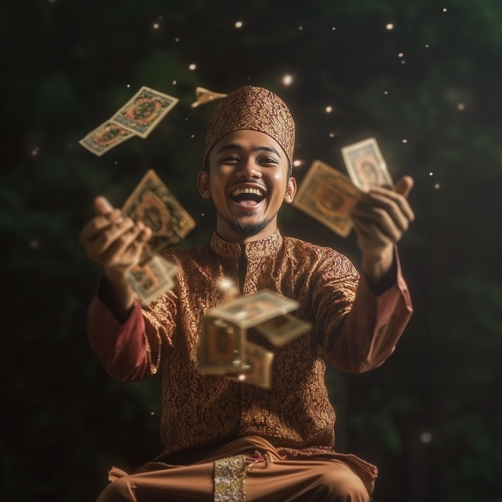Создано на основе запроса: malay man happy holding alot of ringgit, excited face, shining effect from the back