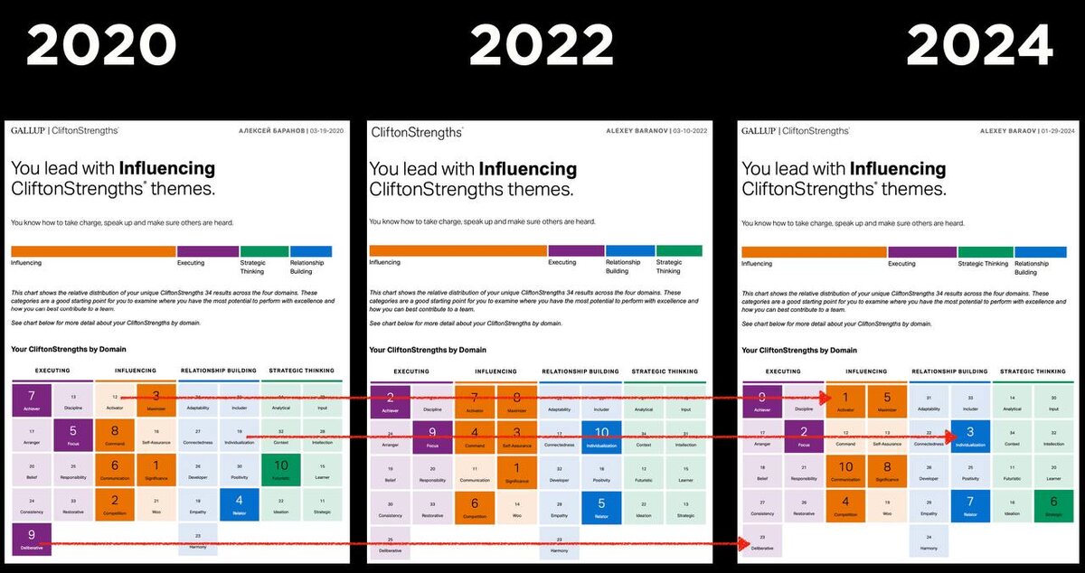Gallup рекомендует перепроходить тест не чаще, потому что он выявляет устойчивые врожденные паттерны мышления, поведения и мотивации.