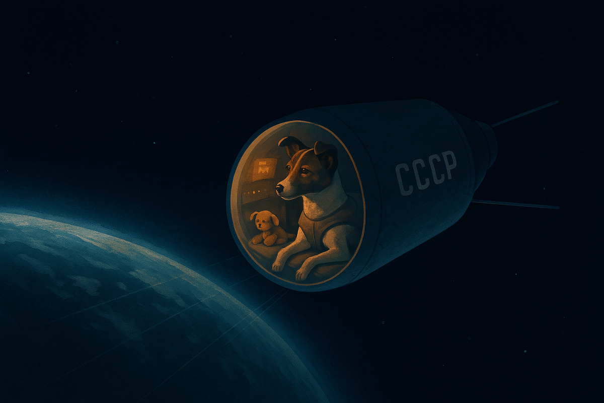Её звали Лайка. Маленькая дворняжка из московских улиц, без роду и племени. Её ласкали, к ней привязывались инженеры, её гладили по шерсти перед самым стартом. А потом она улетела в небо — чтобы уже никогда не вернуться. Лайка стала первым живым существом, вышедшим на орбиту Земли. И первым, кого туда отправили умирать. 3 ноября 1957 года, всего через месяц после запуска первого спутника, СССР потряс мир: в космосе оказался живой организм. Спутник-2 с Лайкой на борту вызывал восторг, трепет, страх. Но в советских газетах не писали главного: аппарат не был рассчитан на возвращение. Это была миссия в один конец. Лайку выбрали не случайно. Идеально подходила: некрупная, выносливая, покладистая. Прошла подготовку: её сажали в тесные капсулы, приучали к шуму, вибрации, перегрузкам. Давали еду из тюбиков. Следили за пульсом, дыханием, поведением. Её готовили не хуже космонавта — только не говорили, что назад она не полетит никогда. Официально заявлялось: Лайка проживёт на орбите несколько д