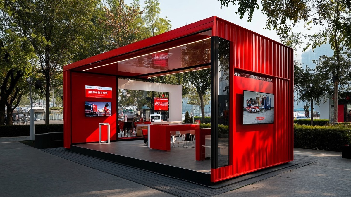 Создано на основе запроса: outdoor booth of TV brand, where the attendance can watch TV and experience the TV, that have red color dominat