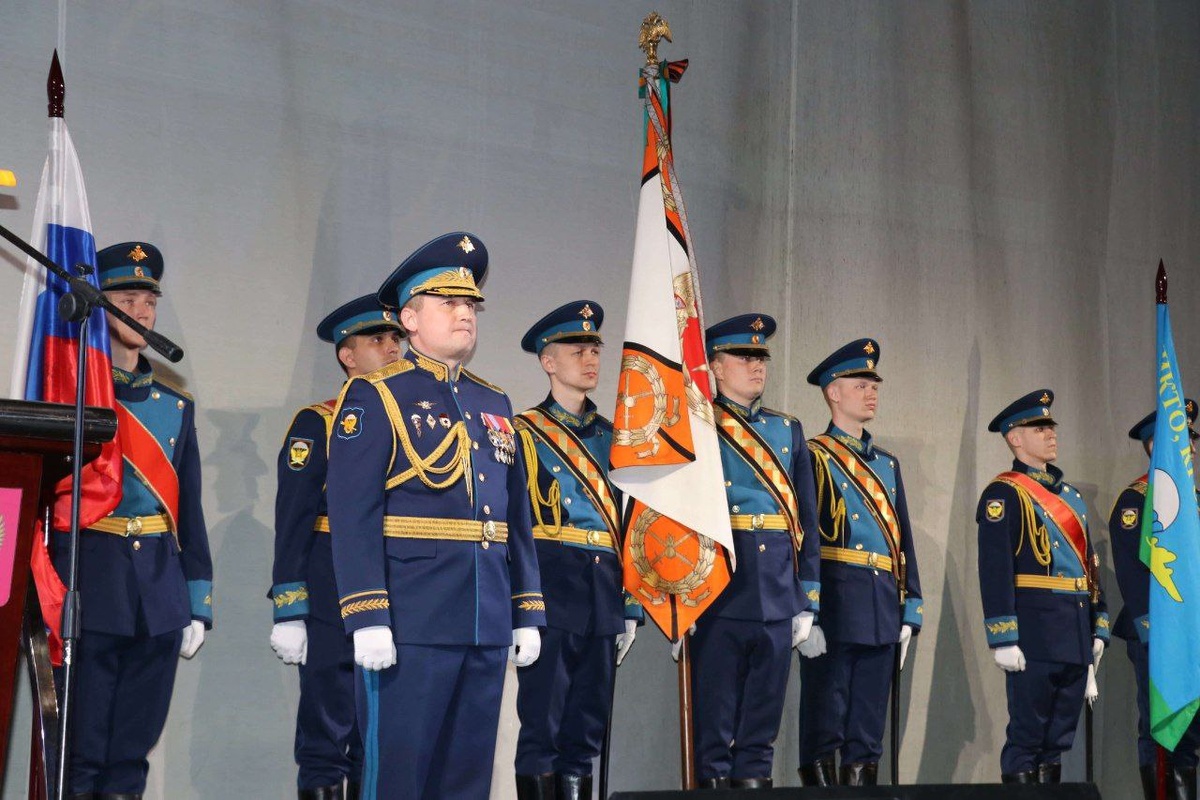 Врио Командующего ВДВ Сергей Чубарыкин прикрепил орден Суворова к полотнищу Георгиевского знамени.