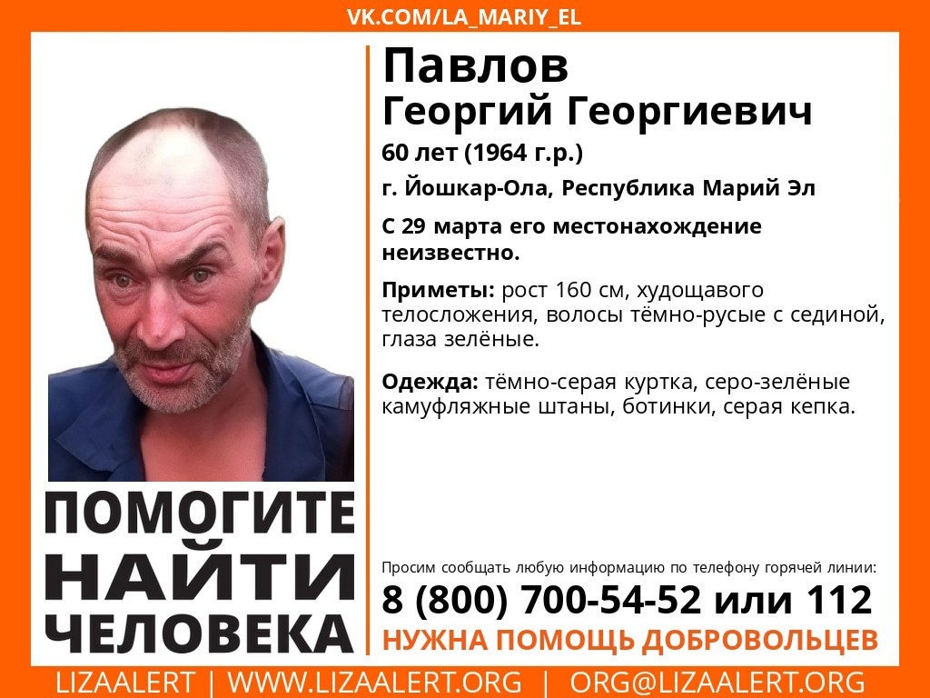 🆘Георгий Георгиевич Павлов - 60-летний житель Йошкар-Олы - пропал 29 марта. С тех пор о его местонахождении ничего неизвестно.
