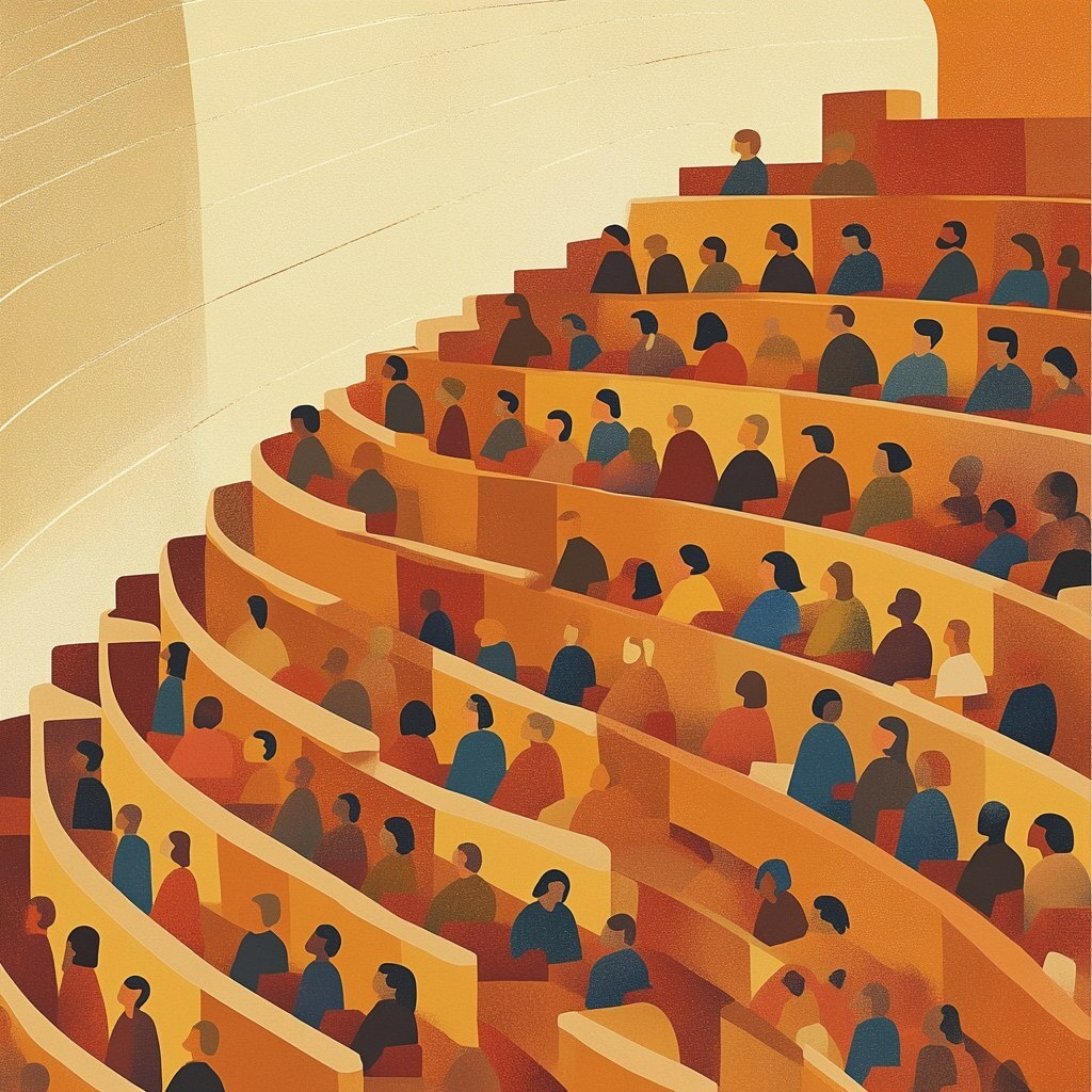 Создано на основе запроса: illustrate a nice icône representing meetings in a amphitheater with mixed-skinned people by a graphic designer