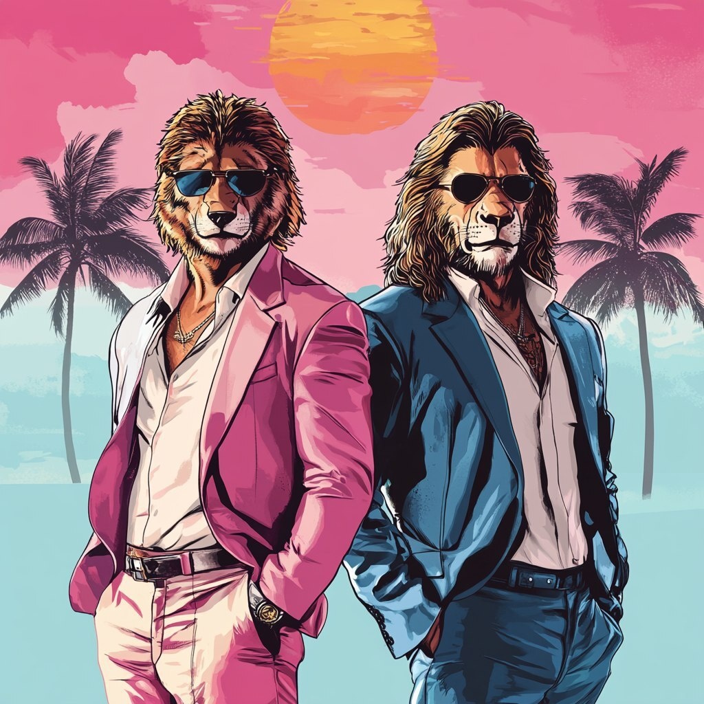 Создано на основе запроса: Make a Wolf and a Lion as the main characters of the serie Miami Vice