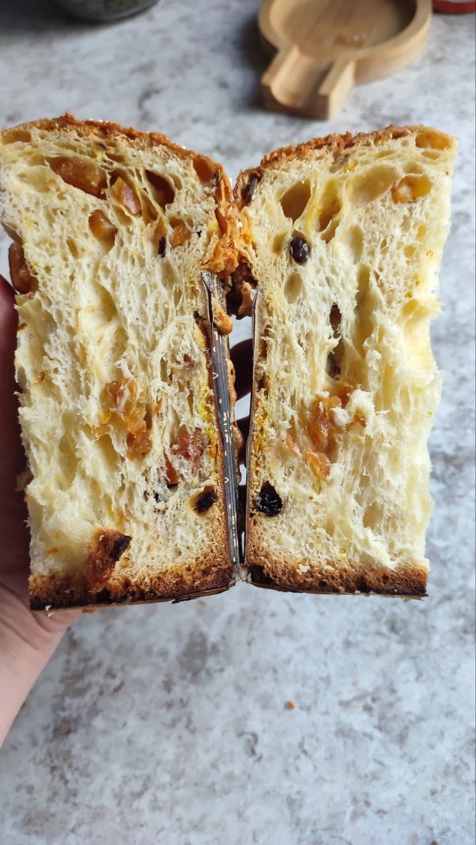 Про пекарский авантюризм или история одного панеттоне 😉😍 Рубрика #расскажуисторию Сначала про авантюризм 🤷🏻♀️ Бывает у вас такое, что планируешь печь одно, но в процессе резко меняешь решение и берёшься за то, что ранее не получалось или давно хотелось, но откладывалось? Думаю, да... Этот рецепт панеттоне попал мне в руки лет 5 назад. Посмотрела я на него, покрутила, повертела... И решила, что уважаемый итальянский пекарь ошибся ноликом где-то, и такое изделие вообще получиться не может! Ну потому что не может! На 1 кг муки приходится 800 г только одного масла! А вся сдоба в сумме это 1,8 кг... На все тот же ОДИН килограмм муки. А ещё поллитра воды и 1200!!?? г цукатов и изюма😵💫🥴 Рецепт выглядел нежизнеспособно и я закинула его подальше. Потом как-то нашла, решила рискнуть. Вышли ну очень вкусные кексы 🤣🤣🤣 Низкие, плотные, жирненькие, сладенькие😂 Тесто при замесе превратилось в масляную кашу! Прибывшие тогда гости алчно уминали вкуснейшие кексы, не подозревая, что п