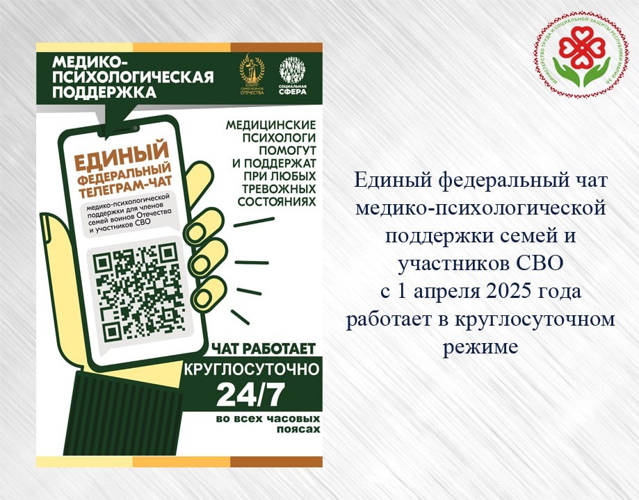 ⚡️С 1 апреля единый федеральный чат медико-психологической поддержки семей и участников СВО, созданный Комитетом семей воинов Отечества, работает в круглосуточном режиме. Жители любого региона, вне зависимости от часового пояса, могут обратиться за бесплатной консультацией к опытным медицинским психологам по различным тревожным состояниям. Общение в чате анонимное, без запроса персональных данных.