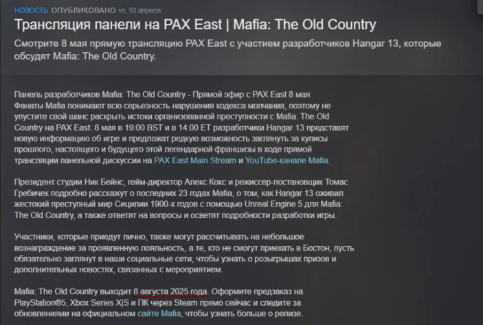 Издатель 2K и студия-разработчик Hangar 13 ненароком объявили точную дату релиза Mafia: The Old Country — игра выйдет 8 августа этого года на ПК (Steam), PlayStation 5 и Xbox Series с полной русской локализацией. Дата засветилась в некоторых иностранных вариантах блог-поста Steam, в котором разработчики сообщили об планах посетить выставку PAX East 8 мая и выйти в прямой эфир. До недавнего времени дата была и в русской версии поста, однако её уже потёрли. Выступление Hangar 13 на PAX East начнётся в 21:00 по Москве. В рамках стрима президент студии Ник Бейнс (Nick Baines), гейм-директор Алекс Кокс (Alex Cox) и режиссёр-постановщик Томас Гребичек (Tomas Hrebicek) раскроют дополнительные подробности игры и ответят на ряд частозадаваемых вопросов. Напомним, в Mafia: The Old Country геймеры попадут не в Америку, а на Сицилию 1900-х годов, где им предстоит принять непосредственное участие в противостоянии мафиозных семей. Протагонистом истории стал бедный шахтёр и сирота Энцо Фавара, у кот
