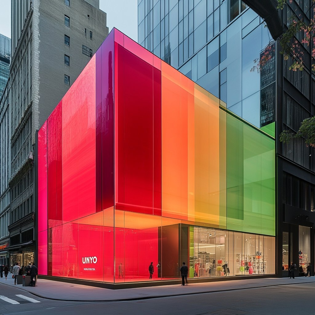 Создано на основе запроса: exterior of UNIQLO new york flagship store in New York with outfitted with layred giant square gradient art from