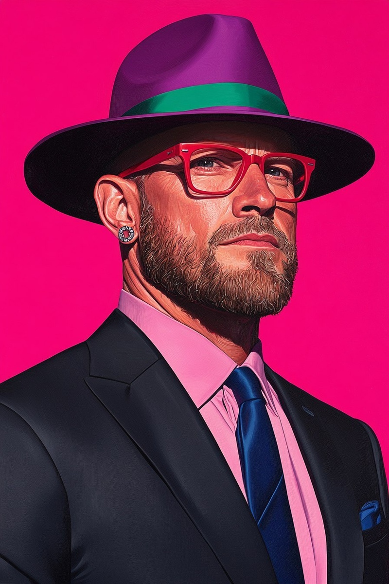 Создано на основе запроса: a portrait of a white man wearing a black suit with a simple pink shirt. He is wearing a solid royal blue necktie. On his head sits a purple hat with a green ribbon. He is wearing red spectacles, and diamond earrings. Flat background. --- Автоперевод: Портрет белого человека в черном костюме с простой розовой рубашкой. Хорошо получилось? 🤔 https://dzen.ru/id/65c0c65c86e4f837c27b24d7 #ИИ #AI #нейросеть #midjourney #art