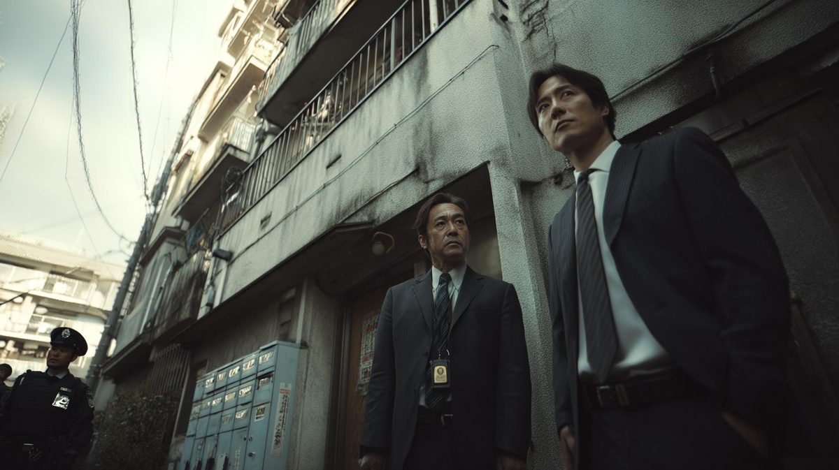 Создано на основе запроса: Ultra-realistic cinematic scene of two middle-aged Japanese detectives in formal suits standing in front of a